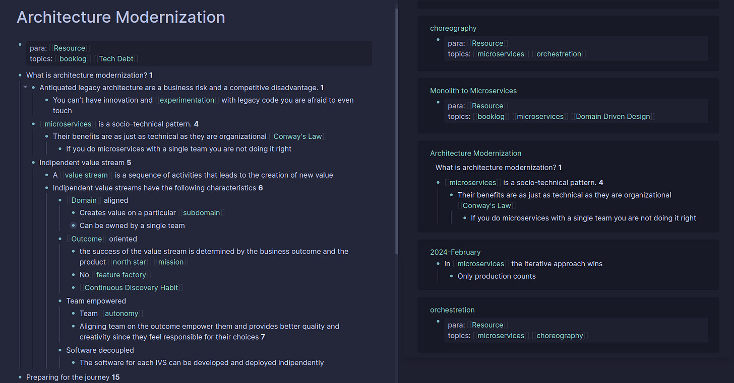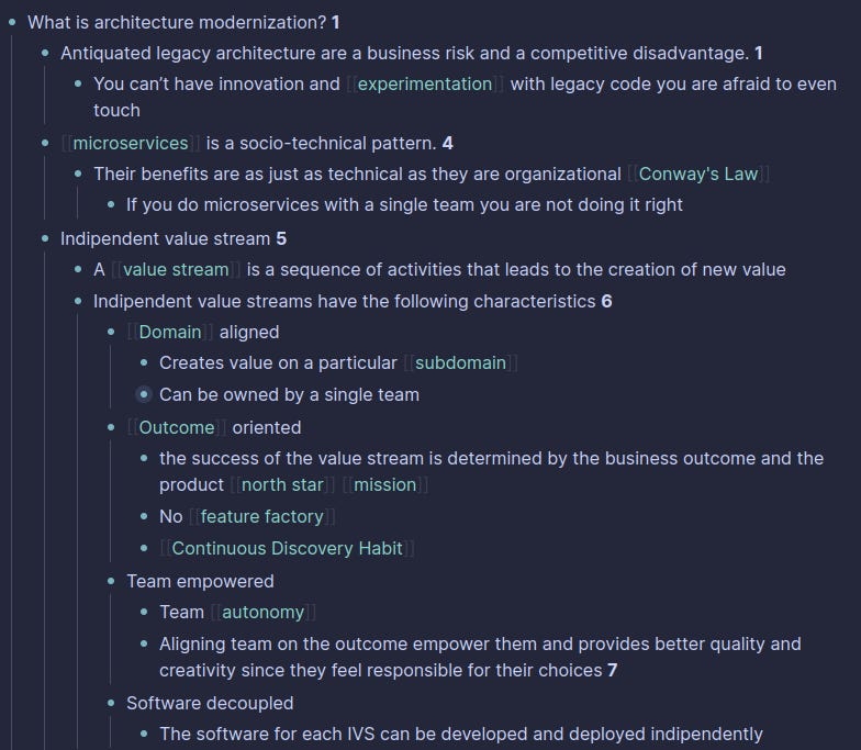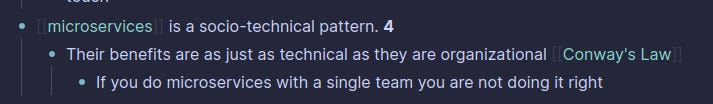 The image above shows an example of the Re-Think process I did for the note microservices is a socio-technical pattern. I use LogSeq for all my notes. In LogSeq, you can create a link by using [[…]]