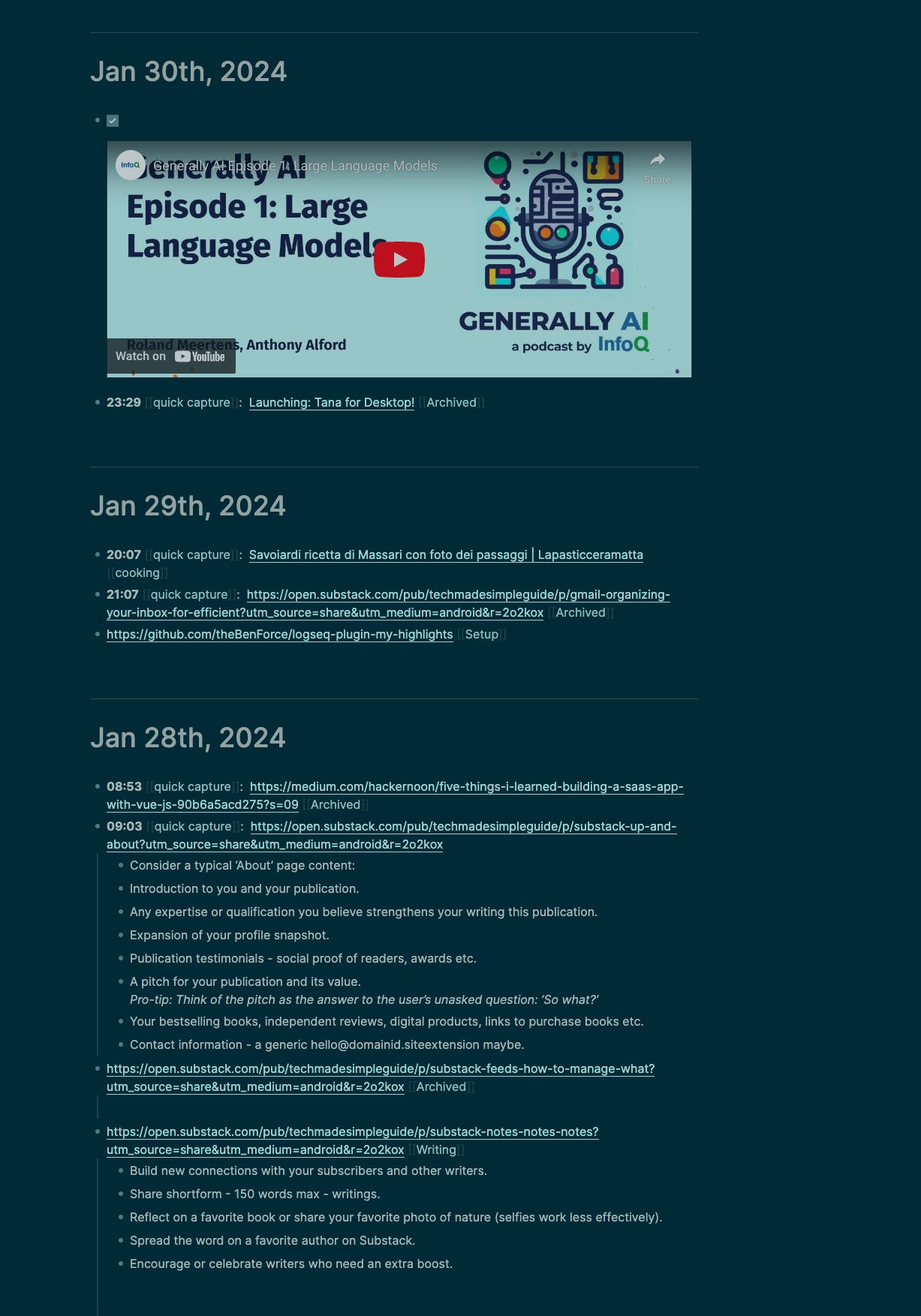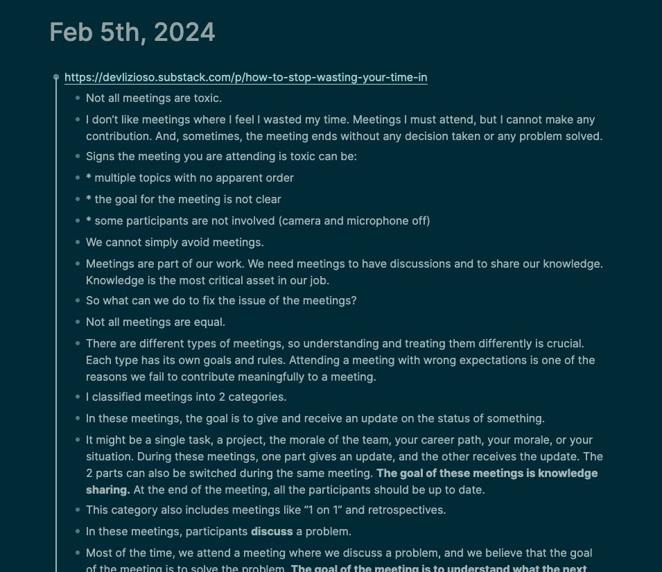 I put all the things I want to save in my journal. They are just a series of bullets on a specific day. I don’t read articles or watch videos in my daily life. I read the title, and if it sounds interesting, I add it to the journal.