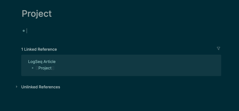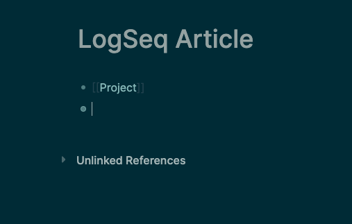If you have a page named “LogSeq Article” and you want to link it to the “Project” page, you can type “[[Project]]” inside that page