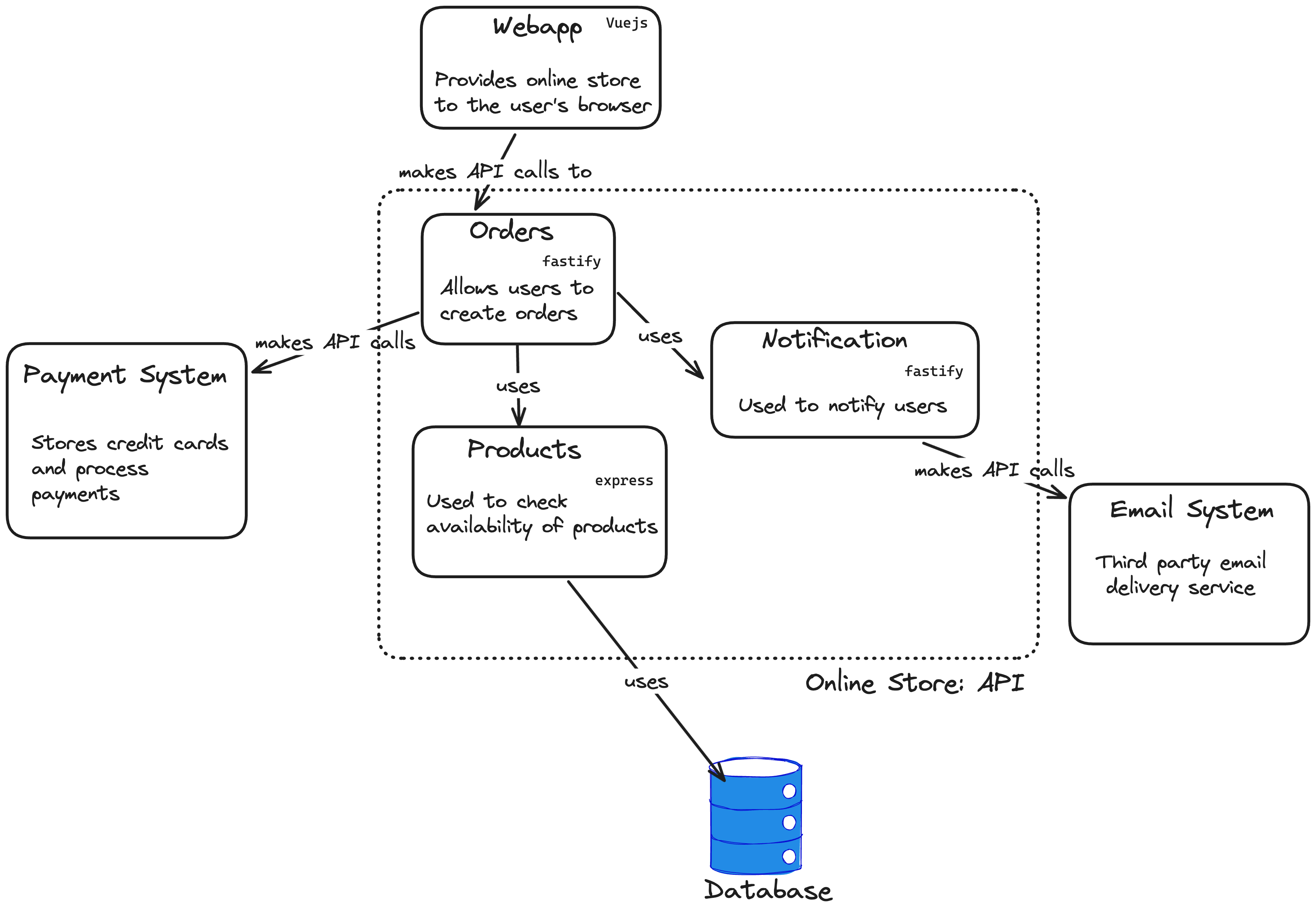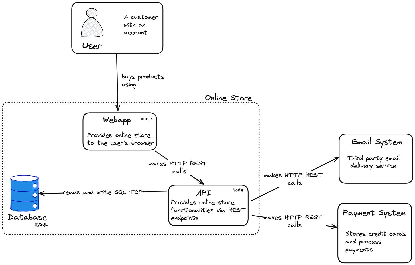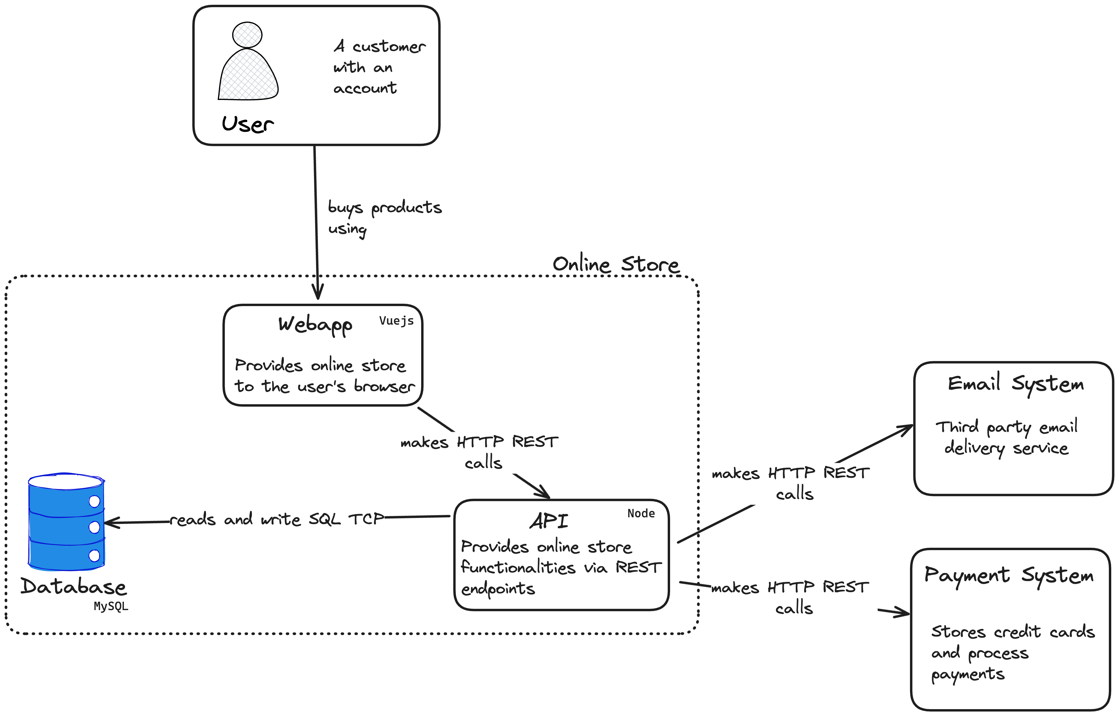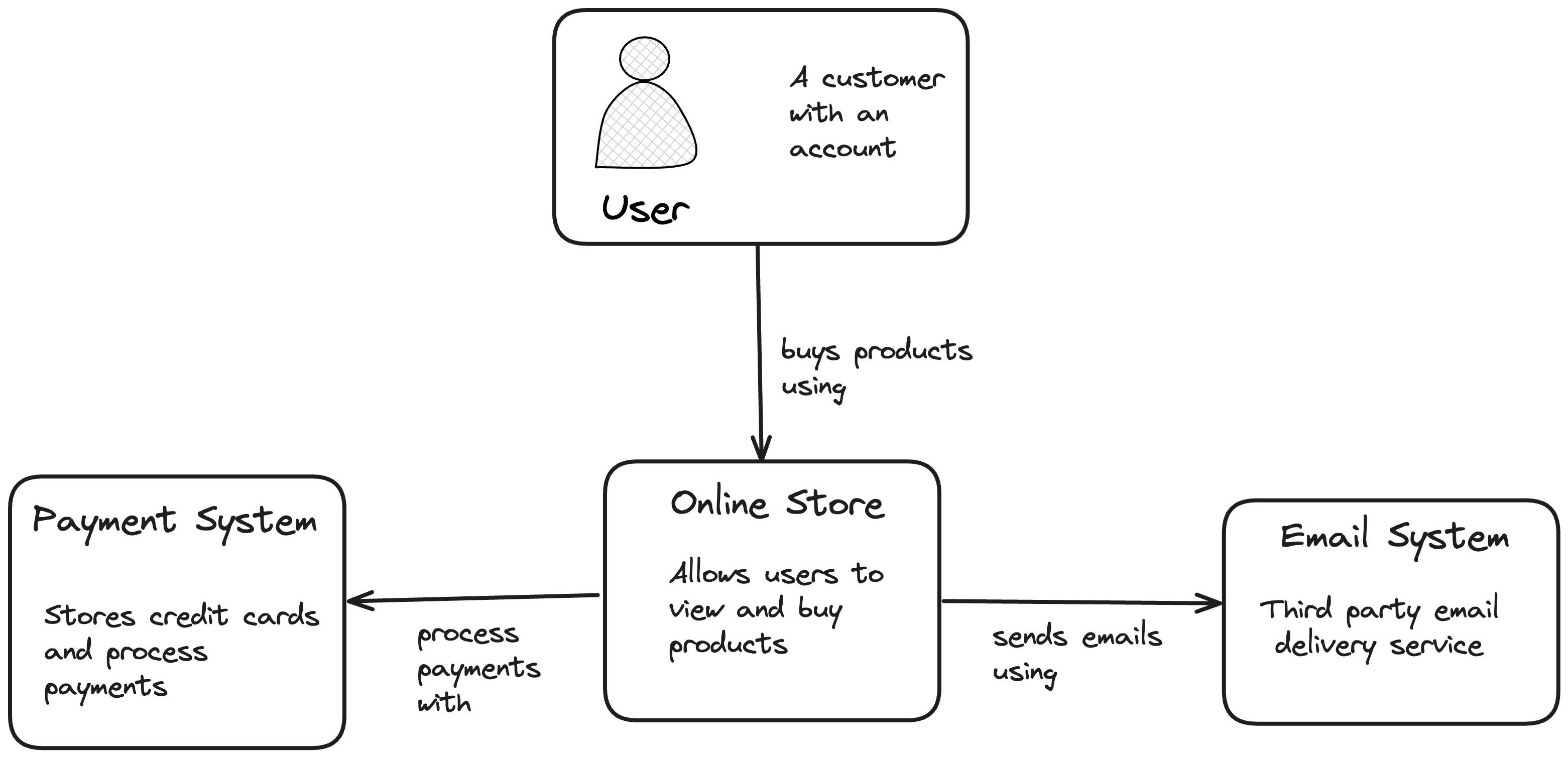 In the above example, the Online Store represents our system. A user interacts with it to buy products. The Online Store uses a Payment System to process payments and store credit card data and an Email System to send emails.