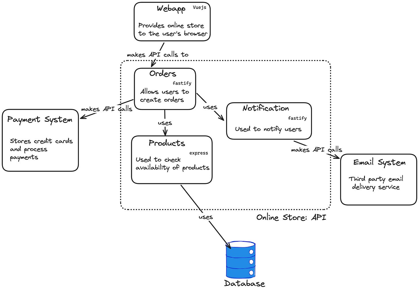 As a developer looking at this diagram, you should understand where the code for a new feature should be implemented. If you look at the diagram, you can see the technologies chosen for each Container (Vuejs, Node, and MySQL). A developer looking at this diagram needs to understand the technologies used.