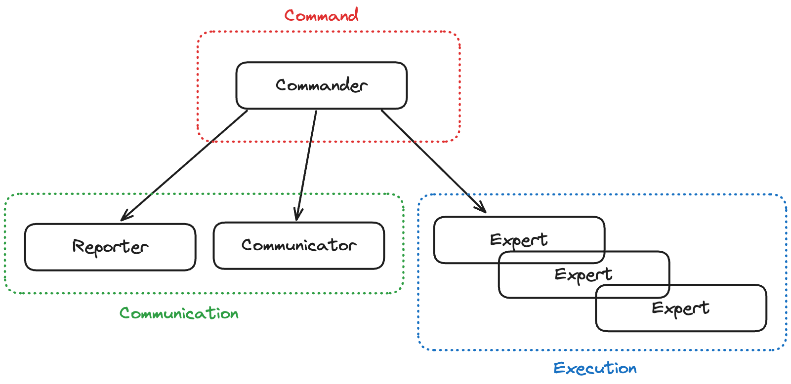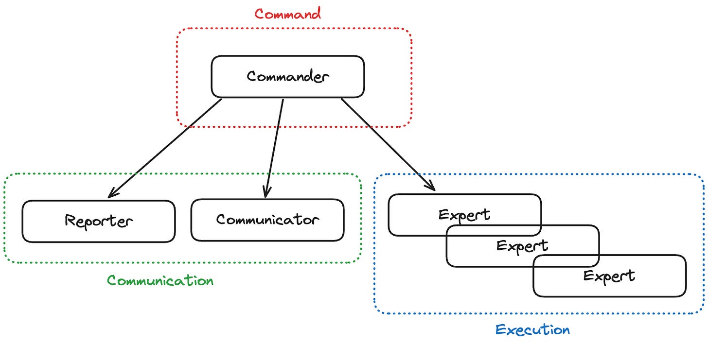 There are multiple Experts because having all the knowledge in a single person is improbable. The Experts must provide the Commander with data and execute the Commander’s plan. The Commander is responsible for the big picture of the situation.