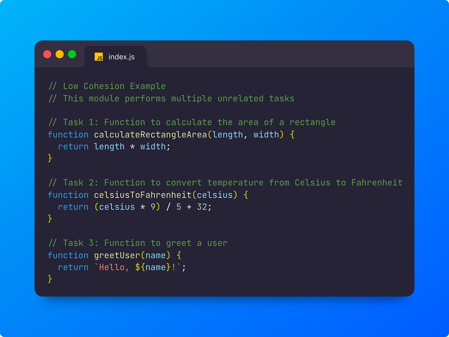 The module above contains three functions utterly unrelated to each other. One has to do with geometry, one with temperature, and one is to greet a user. This is a clear example of naive cohesion.